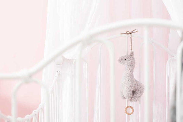 Schöner Musikhänger mit einem Lama. Der Musikhänger ist in Grau, Karamell und Weiß erhältlich und stammt aus der Lama -Sammlung von Jollein. Der Anhänger besteht aus Teddy -Stoff außen und mit Faserfüllung ausgekleidet.