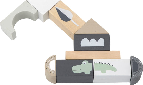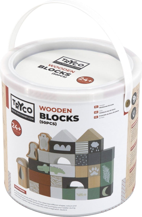 Dieser Blocksatz besteht aus 50 Blöcken. Die Würfel bestehen aus massivem Holz und haben unterschiedliche Formen, Farben und Drucke! Zum Beispiel werden der Dinosaurier, der Krokodil und der Eisbär das Kind beim Bau begleiten.