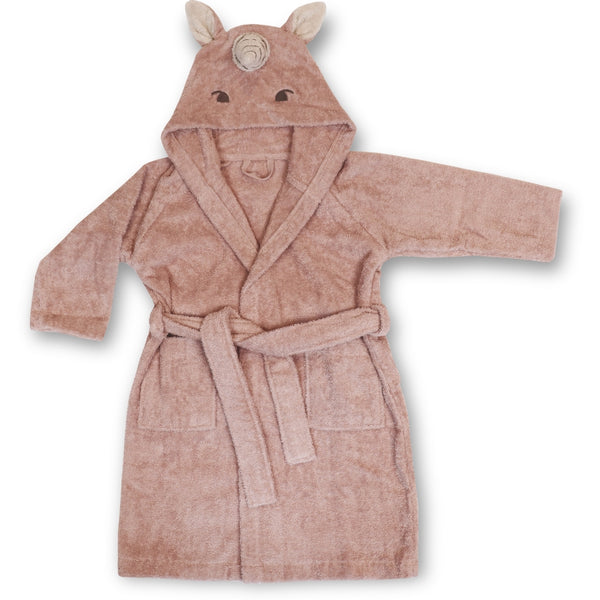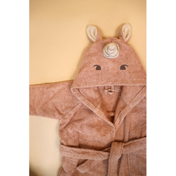 Kinderbademantel aus Bio -Baumwolle. Weiches Achaia -Bademantel, das Ihr Kind warm und trocken hält. Der Bademantel besteht aus 100% biologischem Baumwolltuch und verfügt über ein gestickeltes Tiergesicht und niedliche Ohren auf der Motorhaube.