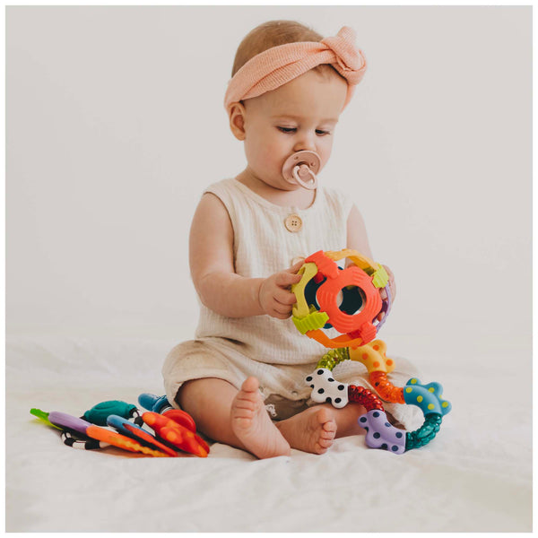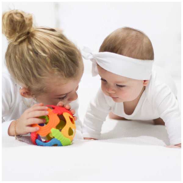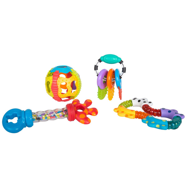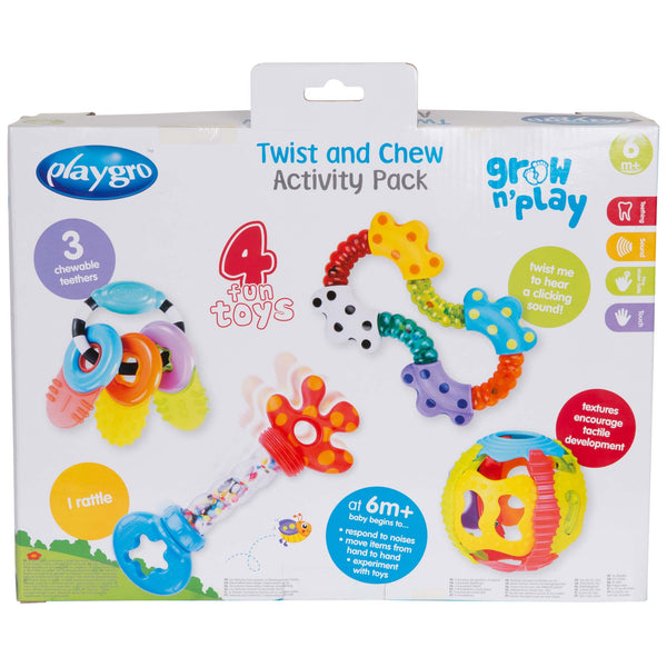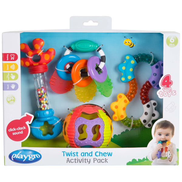 Das Playgro Rammelaar -Spielset ist das ideale Geschenk für Babys, bei denen die Zähne durchkommen und die anfangen, ihren Touchssinn zu entdecken. Lassen Sie Ihr Baby die Rassel schütteln und den Ball rollen, während der Schall die Bewegung stimuliert. Die leicht zu heftigen Klapperklassen für die auditive Stimulation. Mit 4 Entwicklungsspielzeugen, die gerippte Zähne enthalten, um die Schmerzen in den kommenden Zähnen zu lindern, werden Ratschenklänge für die Hörentwicklung, verschiedene Texturen für die Entwicklung des Sinnes des Touchs. Geeignet aus 6 Monaten.