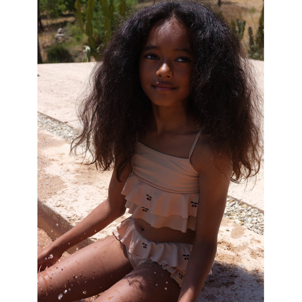 Netter Bikini mit Rüschen und Spaghetti -Bands. Spritzen Sie darauf und erleben Sie ein beispielloses Wasservergnügen. Aus recycelten Plastikflaschen hergestellt.