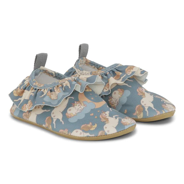 Super süße Schwimmschuhe von Konges Slojd Mit Unicorn -Druck. Wasserschuhe bestehen aus 95% Polyester und 5% Elastan mit niedlichen Rüschen. Die Schuhe haben flexible Gummisälen mit Anti -Slip und sind leicht anzuziehen. Die Wasserschuhe sind ideal für einen Kieselstrand und bieten einen glatten Schwimmbad. Das elastische Material schützt dank des höchstmöglichen UV -Schutzfaktors von UPF 50+ vor UV -Strahlung