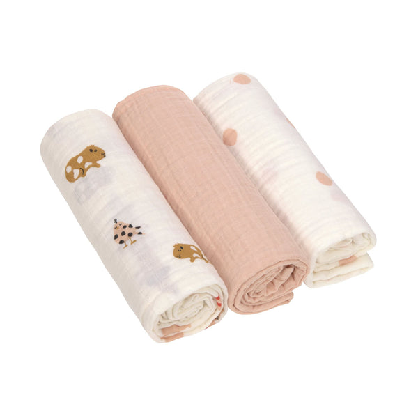 Die 85 x 85 cm großen hydrophilen Tücher aus der Kollektion Lässig Little Mateys sind in drei Teilen, in einfachen Farben und mit verspielten Drucken.