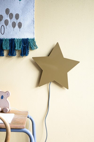 A wall lamp in the shape of a star which fits well in a baby or nursery. The lamp gives a cozy light and the wall lamp is gold.