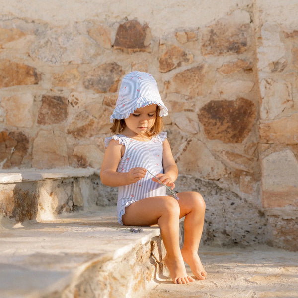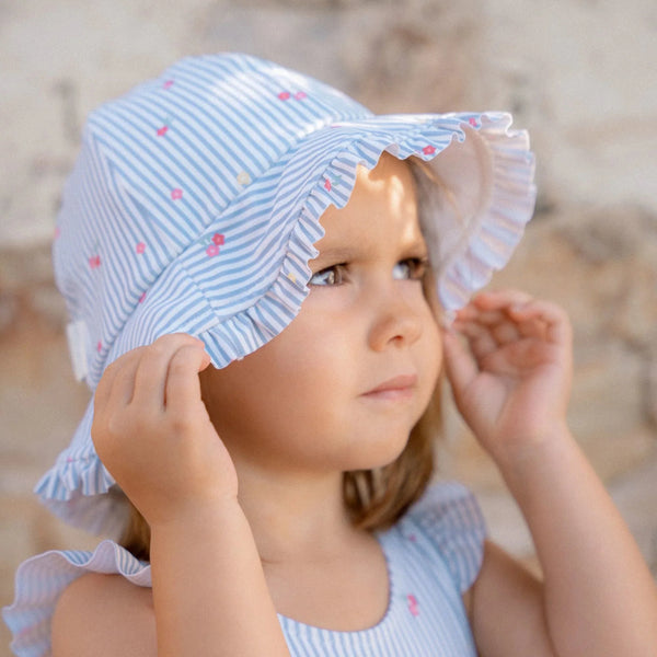 The wide brim with cute ruffles provides optimal shade and sun protection while playing in the garden, at the beach or by the pool. Made of soft, breathable fabric and available in three sizes so the hat always fits properly.