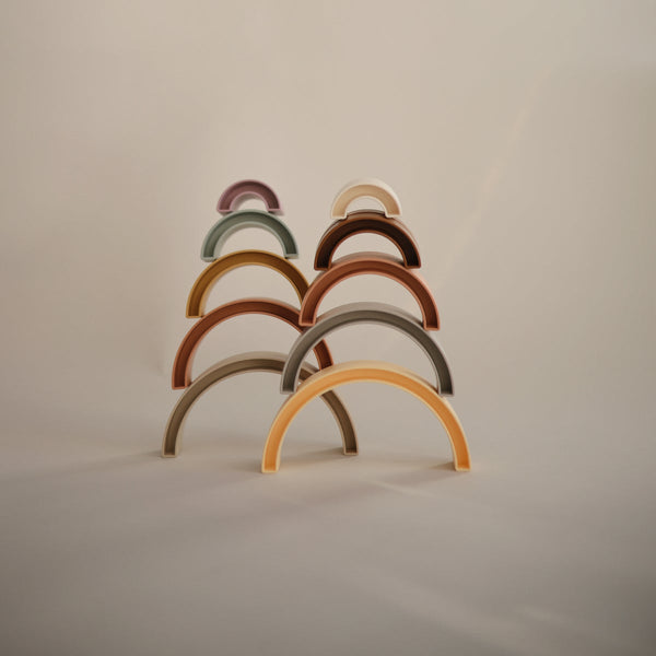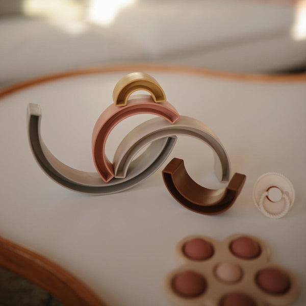 Playful rainbow stacking tower inspired by the rainbow sky. The stacking tower consists of five arches for stacking, balancing and sorting.