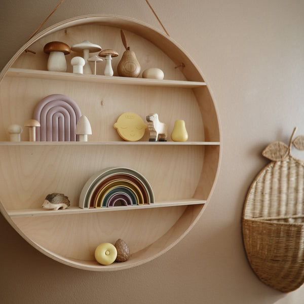 Little ones can sort, stack and play with this beautiful set while learning with soft colors and developing their fine motor skills.