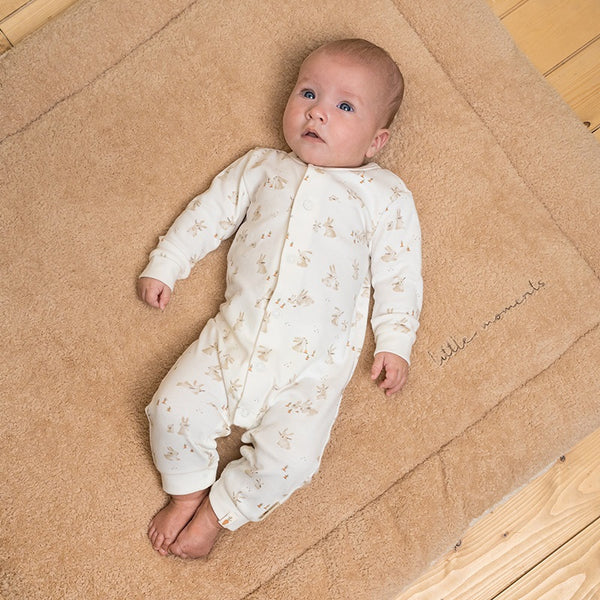 The teddy fabric adds an extra touch of softness, making the playpen rug not only very soft but also a beautiful addition in the playpen. The polyester filling provides a comfortable surface, perfect for playtime and naps. Thanks to its two sides, the Little Dutch play rug is suitable for any style. On one side the playpen rug features a sweet bunny and on the other side the rug has a darker color and a beautiful text. The details on the rug are subtly incorporated and make a beautiful whole.