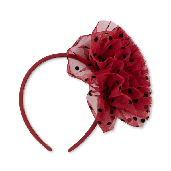 Konges Sløjd Flamenco dress made with a velvet top and a six-layer mesh tulle skirt with polka dots. Closes with a single pearl button at the back neckline. Comes with a hairband decorated with three tulle bouquets with polka dots.