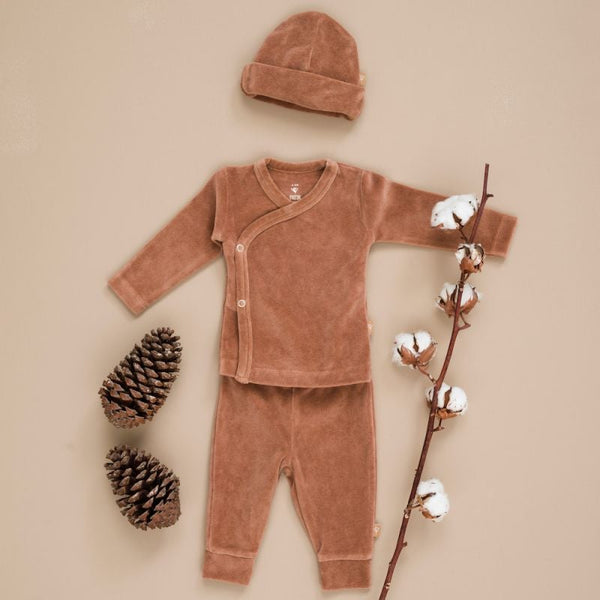 The wrap cardigan from Fresk is easy for your baby to put on and take off. The cardigan has two push buttons on the front and one on the inside to keep it closed. The wrap cardigan can be combined well with uni pants of Fresk.