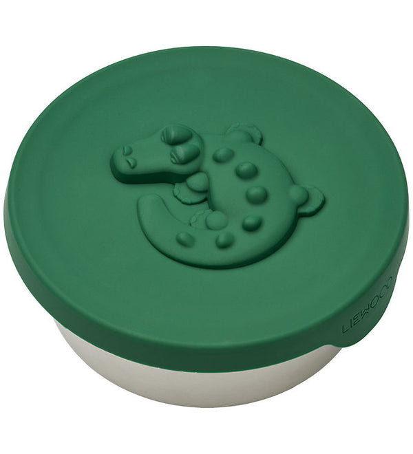 Smart snack box from Liewood in a steel color with a green silicone lid topped with a raised crocodile. It consists of one large space. The lid is made of flexible silicone, which fits well and holds firmly.