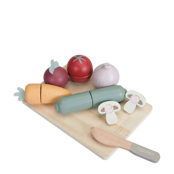 Eat vegetables every day! This set of wooden vegetables is a fun way to encourage role play in your child. Cooking together is so much fun! Chop the vegetables on the cutting board in half with the wooden knife and become a top chef. The included vegetables are: carrot, cucumber, tomato, onion, beet and a mushroom. Everything can be cut in half and is easily glued back together by the Velcro.