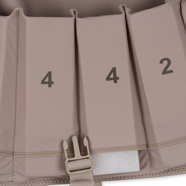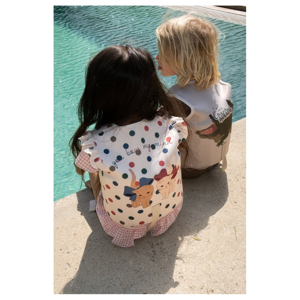 Awesome swimming vest with print from Konges Slojd. Padded lifejacket made of 80% neoprene and 20% polyester. With zipper and velcro closure. With safety harness with buckle so your child can never slip out of the vest.