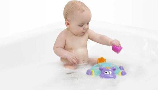 This brightly colored hippopotamus provides lots of bathtime fun. With the four shape cups your child can scoop, pour water and place them on the right spot of the hippopotamus. With the textured rings you can throw or hang around the hippo. Good for baby's cognitive development and problem-solving skills.