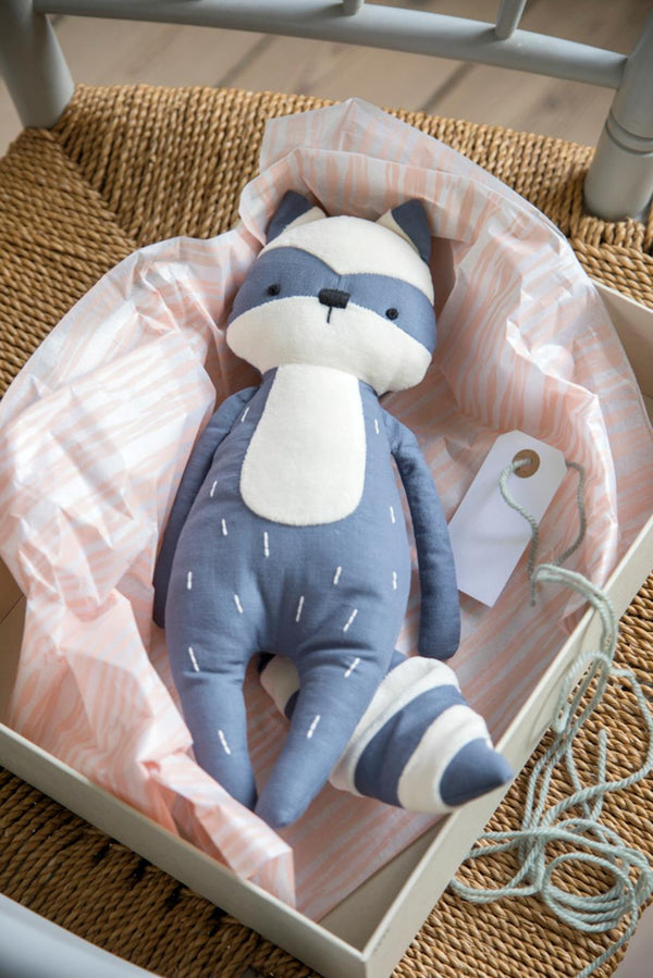Adorable peluche en forme de Rebel le raton laveur de la collection Woodland. Rebel est d'un beau bleu 'blackberry blue' et a des marques blanches sur le visage, la queue et le corps. Les marques blanches sont en velours doux. De jolis accents brodés sur le devant donnent vie aux traits du visage de Rebel.