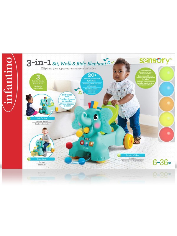 Cet éléphant 3 en 1 (s'asseoir, marcher et rouler) est très amusant pour les bébés et les jeunes enfants ! Au début, assis sur ou à côté de l'éléphant, votre bébé aura beaucoup à découvrir : boutons lumineux, chansons et sons. Lorsque votre bébé est prêt à se tenir debout et à apprendre à marcher, relevez le siège. Cela permet de soutenir votre bébé lors de ses premiers pas. Vous pouvez régler la vitesse des roues pour que votre bébé puisse se promener à son rythme avec cet éléphant fou. Prêt pour la course ! Posez le siège et c'est parti ! Placez toutes les balles sous le siège, faites-les sortir et ramassez-les pendant que vous conduisez. L'attrape-balles permet de récupérer facilement les balles et de les ranger pour plus tard.