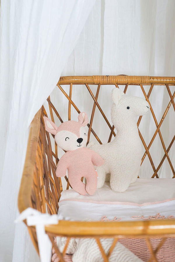 Mignon petit cerf en peluche. Le doudou tricoté est disponible en vert et en rose. Le doudou est fabriqué en 100 % coton et son ventre est garni de fibres 100 % polyester. Le doudou mesure 21 cm de haut.