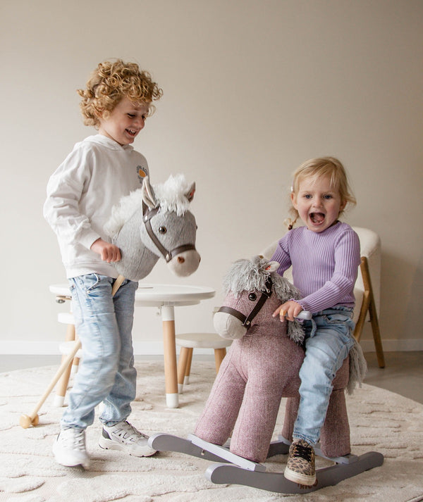Dit stokpaardje is mooi afgewerkt en heeft een luxe-uitstraling door het ruiten stofje en kunststof halster. De wieltjes aan de onderkant zorgen ervoor dat het kindje gemakkelijk door de kamer kan paardrijden. Het kindje kan zich vasthouden aan de houten handvatten. Wanneer er op het oortje wordt gedrukt, maakt het paardje een geluid!