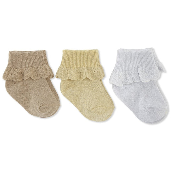 Schattige en zachte lurex sokken met ruches. Komt in een 3-pack. Deze schattige en zachte sokken met ruches maken de outfit van je kind compleet. Super leuk om aan te doen en dankzij de verschillende kleuren perfect combineerbaar met de meeste looks.