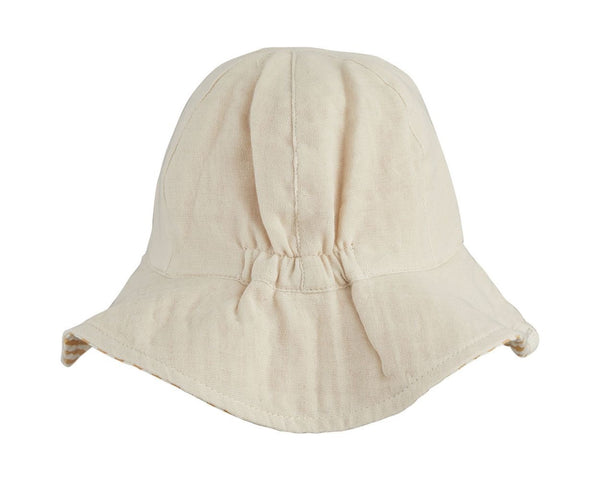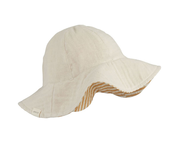 Dit zandkleurige zonnehoedje van Liewood is aan beide zijden draagbaar. Je kunt kiezen tussen een zandkleurige kant of een kant met witte en okergele strepen. Het hoedje heeft een elastische achterzijde.
