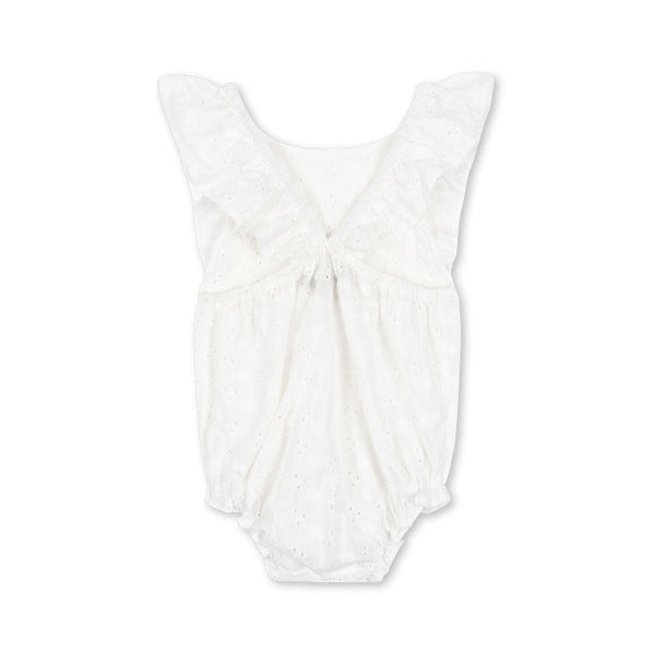 Luchtige mouwloze romper van Konges Slojd met broderie anglaise en ruches. Gemaakt van 100% katoen, ideaal voor zomerse dagen.