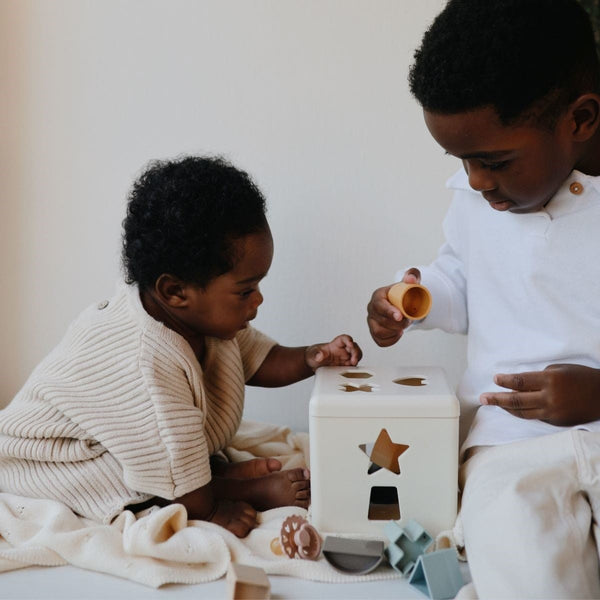 De mooie vormenstoof van Mushie. Een prachtig kraamcadeau en een favoriet speelgoedje voor jonge kinderen! Met 12 vormen in zachte kleuren, zullen kinderen hun fijne motoriek uitbreiden door vormen te matchen met hun gepaarde uitsparingen.
