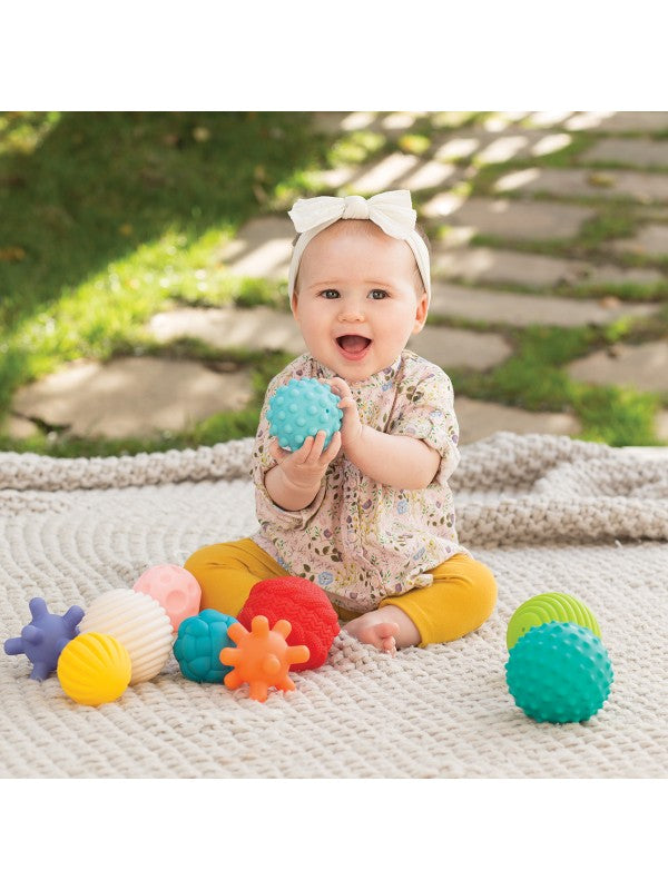 Deze speelballen stimuleren op een speelse manier de zintuigen van je baby. Door de verschillende kleuren en oppervlaktestructuren is de verveling nooit een probleem! De set bevat in totaal 10 sensorische ballen waar je baby mee kan spelen. Door hun handige formaat zijn ze gemakkelijk vast te houden in de handen van kleine kinderen. Ze helpen ook bij de pijn als de eerste tandjes doorkomen. De ballen zijn geschikt vanaf 6 tot 36 maanden. Ook te gebruiken in bad.