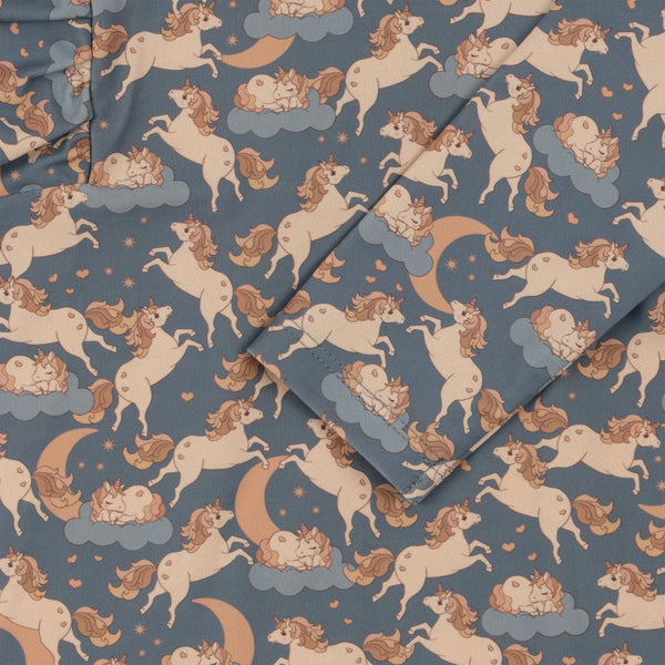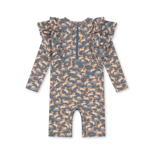 Dit schattige zwem onesie van Konges Slojd heeft lange mouwen en sierlijke ruches voor een speelse uitstraling. De ritssluiting in de nek zorgt voor gemakkelijk aan- en uitkleden. Het elastische materiaal biedt de hoogst mogelijke UV-bescherming met een UPF 50+ rating, zodat je kindje veilig van het water kan genieten. Dit zwempakje is CE-gecertificeerd voor extra zekerheid.