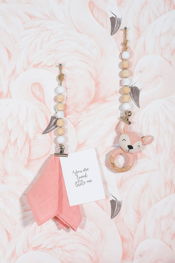 Schöne Zähne von Jollein Mit gestrickten Hirschen. Die Zähne sind in den Farben grün und rosa erhältlich und haben einen Durchmesser von 7 cm. Das Tier auf den Zähnen besteht aus gestrickter Baumwolle, gefüllt mit Polyester und der Ring selbst besteht aus Holz. Es gibt eine Glocke im Tier.